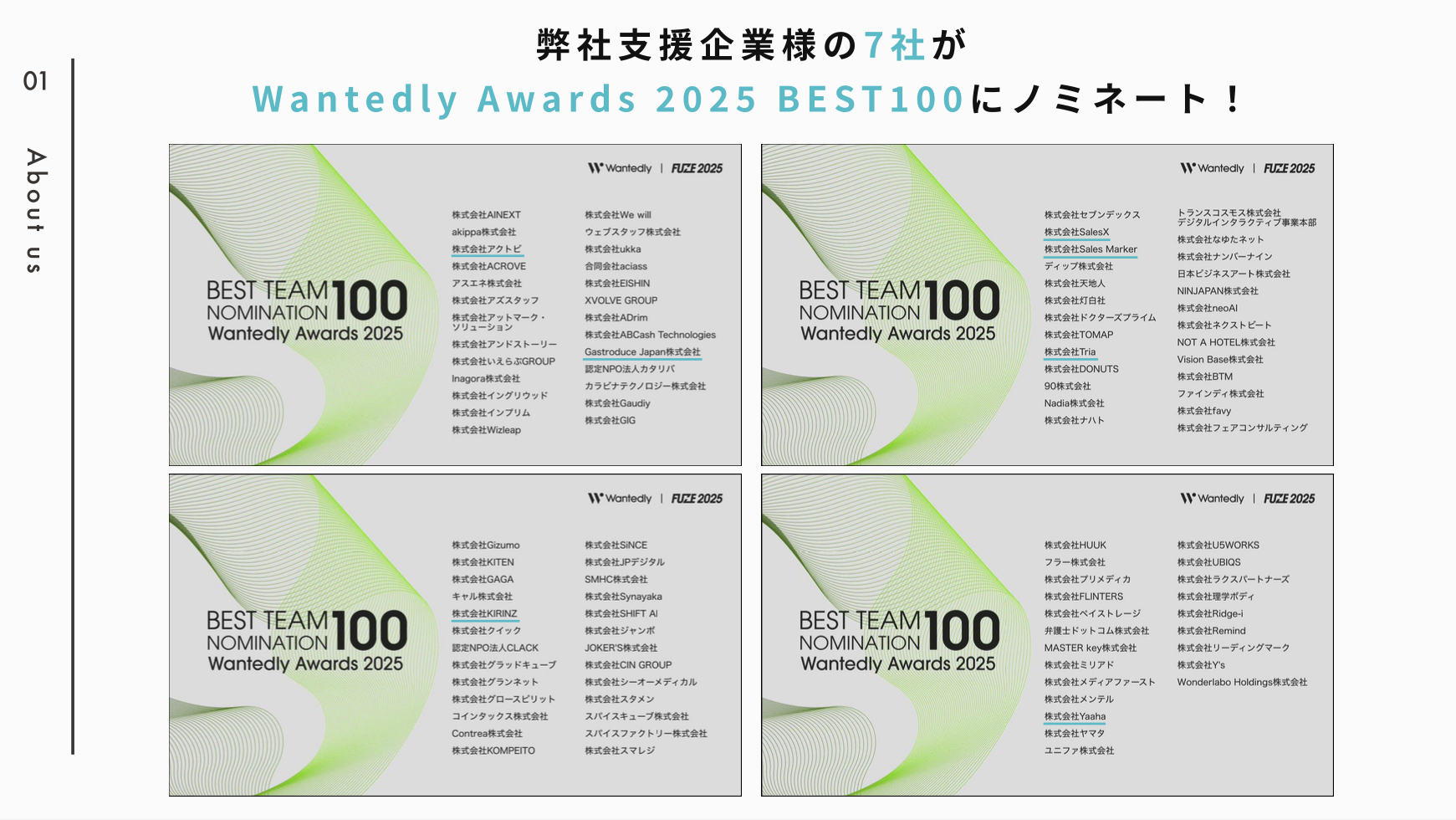 今年度行われた『Wantedly Awards 2025』の「BEST TEAM NOMINATION 100」には、支援先7社、そのうち1社はWantedlyを利用開始から1年以内で最も成果を上げた企業である「TEAM OF THE YEAR ROOKIE」に選出されました。