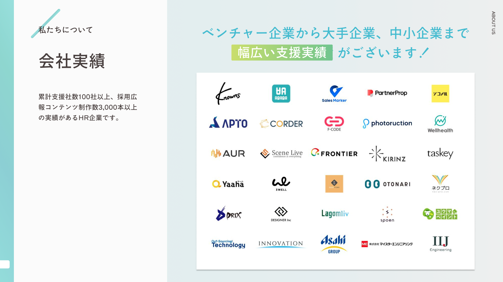 Sales Marker / KIRINZ / ABABA / パートナープロップ / シコメルフードテック / フォトラクション / ノウンズ / SAKIYOMI / yaaha / アクトビ / アサヒグループ / エフ・コード / アウトソーシングテクノロジー / マイスターエンジニアリング / フロンティア / イノベーション / IIJエンジニアリング / グローバルトラストネットワークス / フロンティアコンサルティング etc...