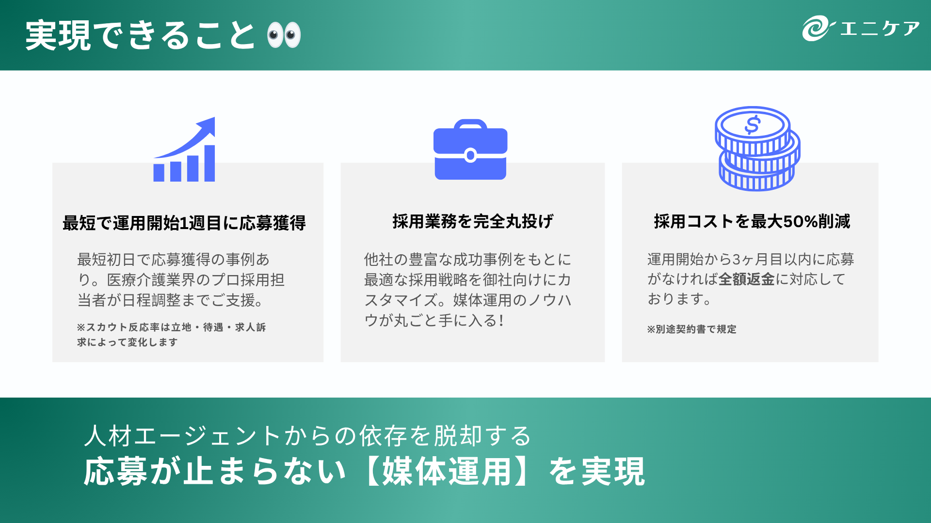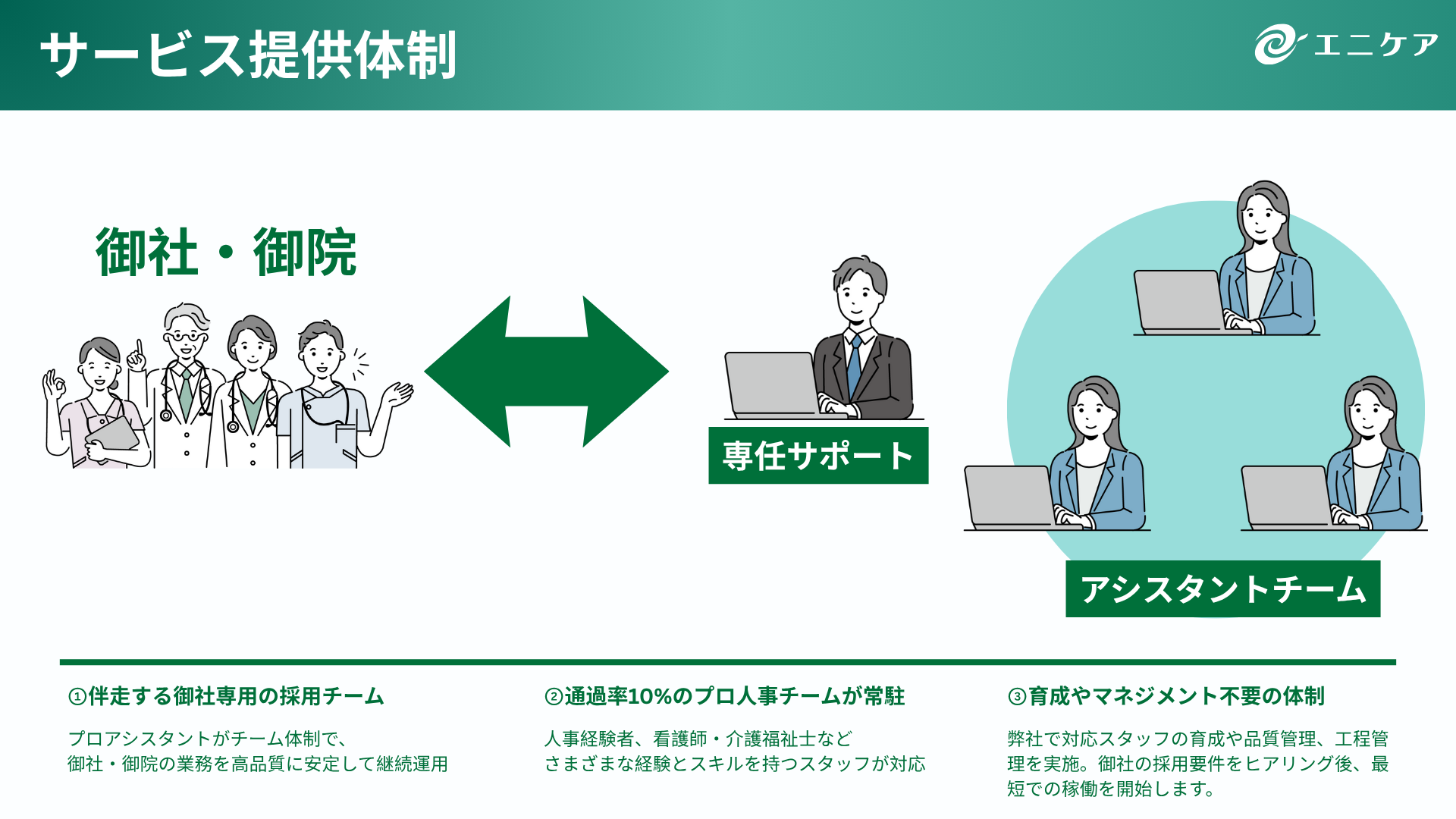 医療介護業界の採用ノウハウが豊富な担当が御社専属の採用担当として稼働するので、正社員として増員するよりも安く採用力を強化できます。