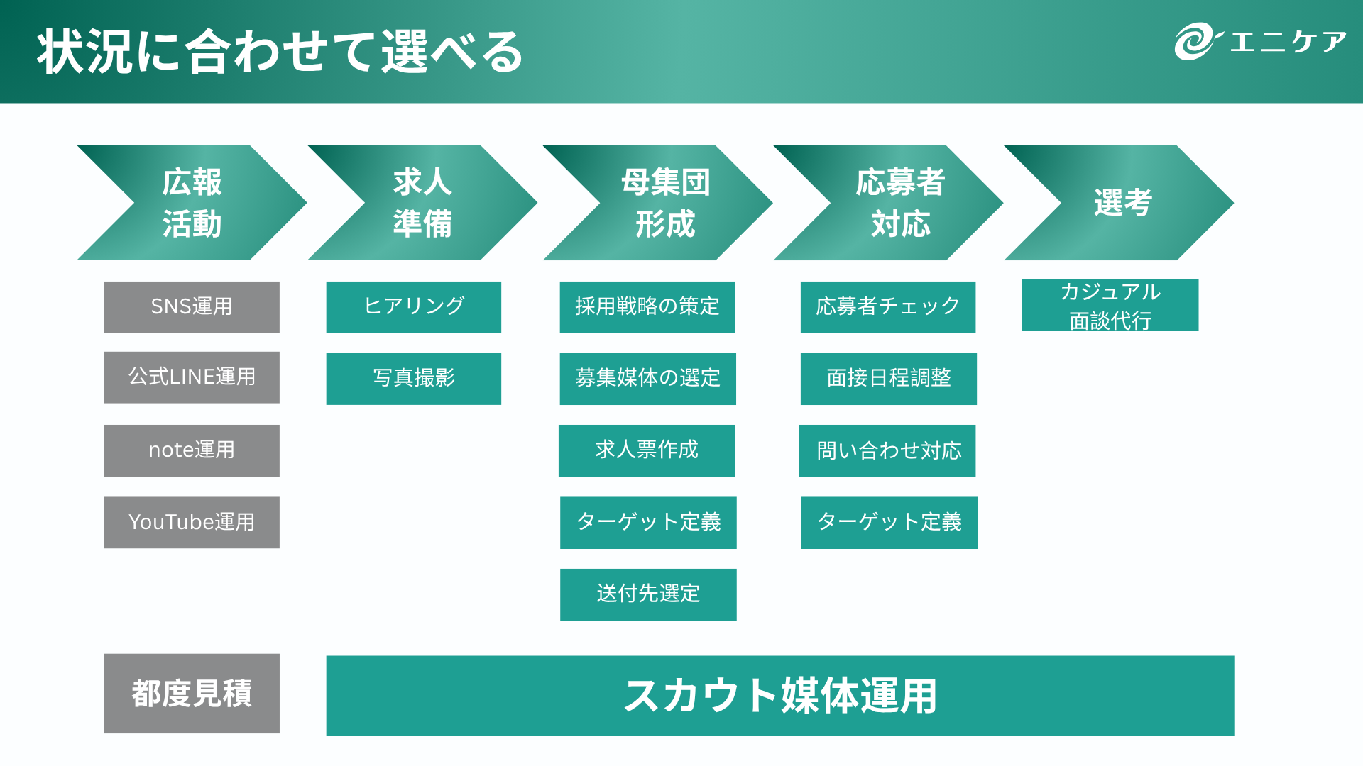 候補者の獲得からお忙しい採用担当者様の業務巻き取りまで様々な状況に柔軟に対応します!