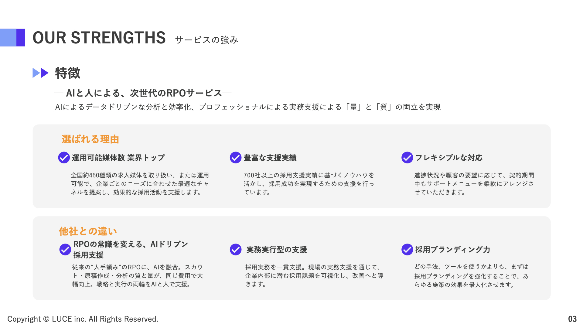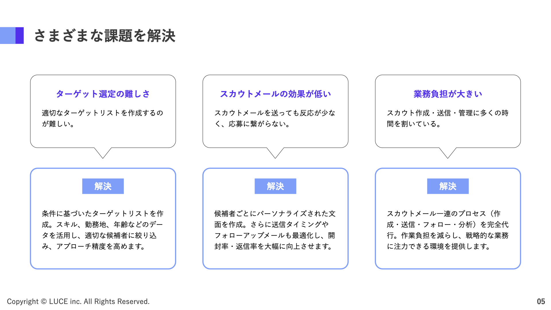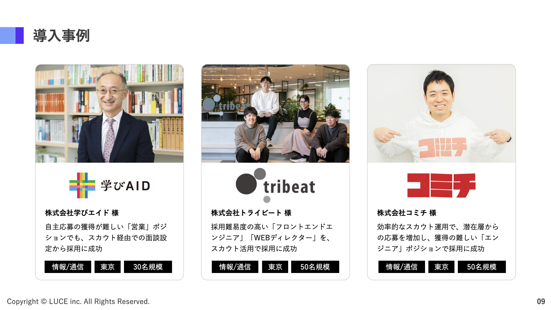 ターゲット人材へのアプローチを最大化いたします。単なるツールの運用に留まらず、貴社の採用ブランディングの強化も同時に実現いたします。