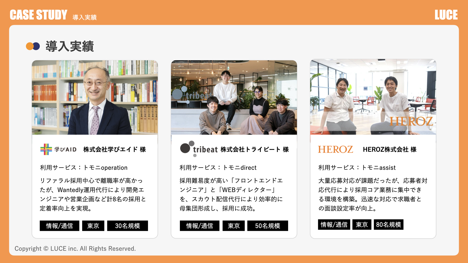 RPOサービス「トモニ採用」は、ターゲット人材への直接アプローチ、魅力的な企業イメージの発信、採用プロセスの効率化、即戦力人材のシェアなど、各フェーズで最適なサポートを提供します。