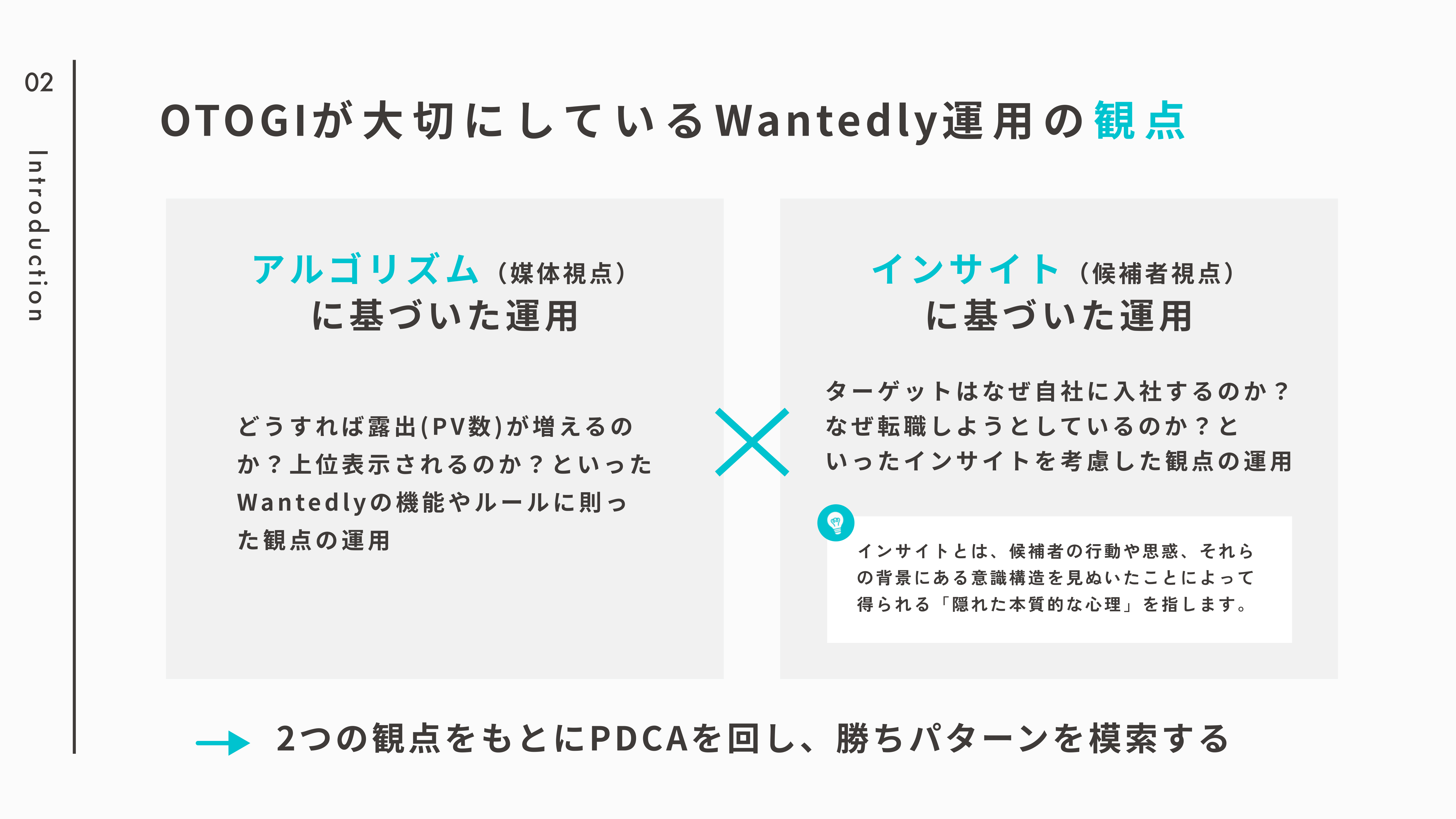 本資料では、「アルゴリズム(媒体視点)」と「インサイト(候補者視点)」の2つの観点から、Wantedlyの具体的な運用術を紹介します。ぜひ、ご覧ください。