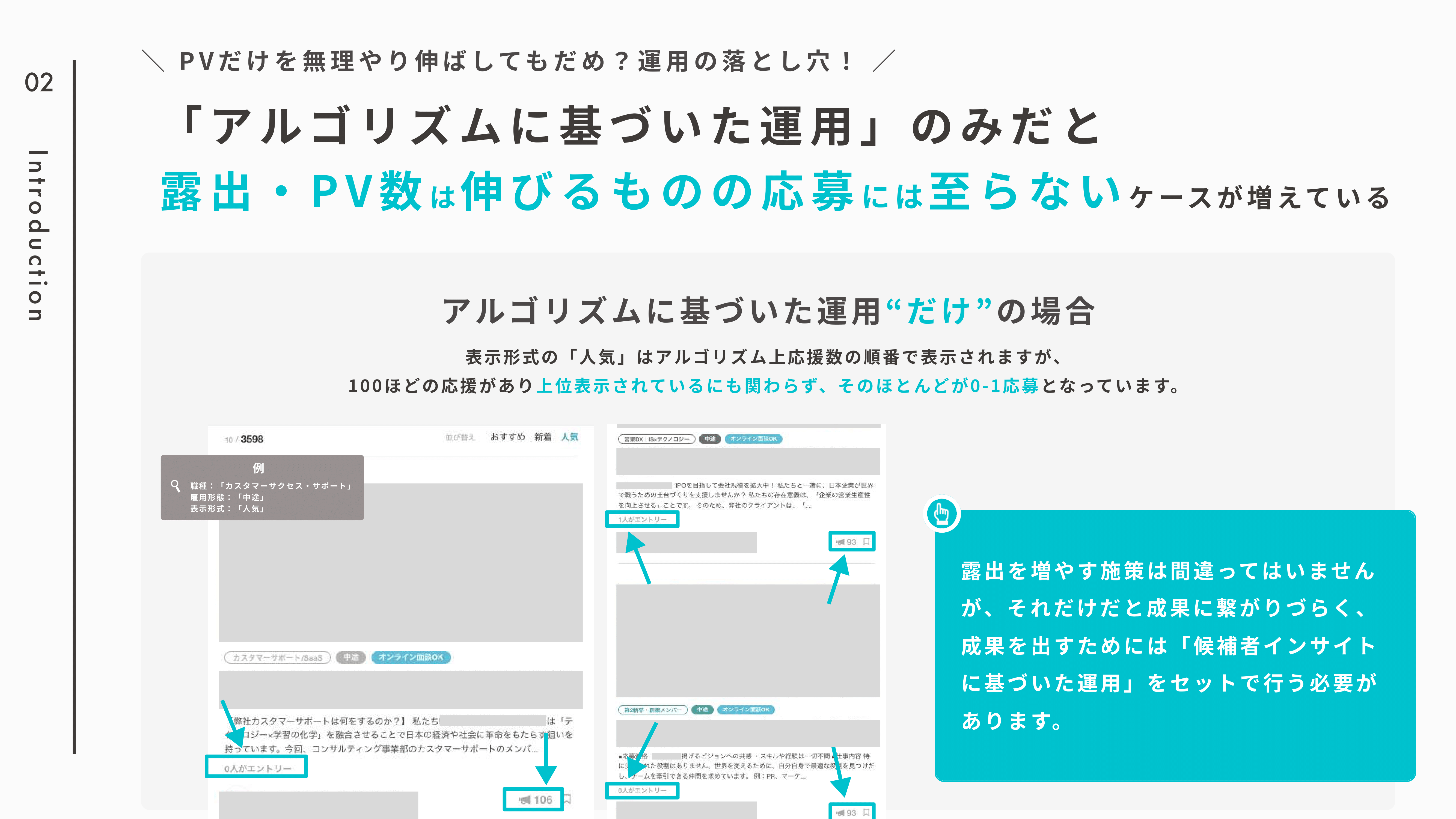 Wantedlyは、「採用単価の削減」「運用工数の削減」「コンテンツの資産化」など、複数の効果を狙えるサービスですが、PV数など、Wantedlyの機能やルールに則ったアルゴリズムの観点"だけ"での運用では、閲覧はされるが、応募が増えないというケースも発生しています。